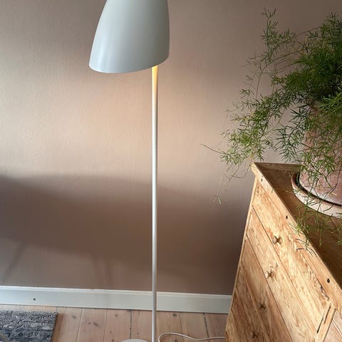 Standerlampe fra Less’n’more i clean futuristisk design. Fed lampe, hvor man frit kan pege lyset hvor man ønsker ved blot at bøje den røde stof-beklædte del af lampen. Man kan endda justere bredden på lyskeglen ved at dreje på hovedet af lampen - de eksempler i de sidste billeder.