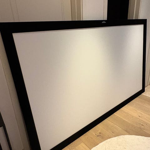 Fastrammelærred, lydtransparent 16:9 / 303 x 171 cm. Kan tilskæres til mindre format. Topkvalitet, bestilt på mål i DK.