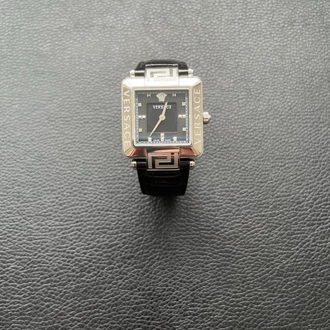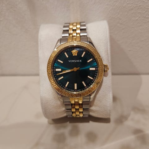 Versace dameur med sort urskive og guldfarvet ramme. Uret har et unikt design med detaljer i sort og guld, velegnet til kvinder. Leveres i original opbevaringsæske.