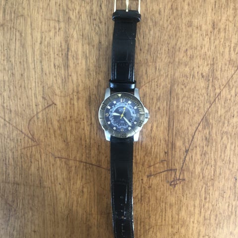 Vintage Camel Trophy Adventure 7 Watches herreur med brun læderrem og urskive med kronograffunktion. Uret har en rund urskive med tydelige markeringer og et robust design. Leveres med original opbevaringspose og forsikrings- og garantibevis.