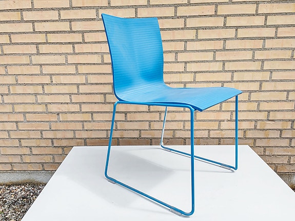 Lakeret stål og kunststof, bøjelig stamme og skærm af blå plast. Fremstår med lidt brugsspor på armen