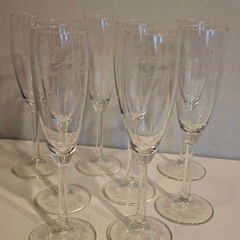 Sættet består af syv elegante champagneglas i klart, krystalklar glas med en slank design. Hvert glas har en smuk fod og et dekorativt mønster, der tilføjer en sofistikeret detalje. Glassene er perfekte til festlige lejligheder.