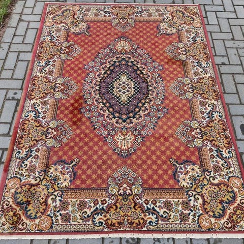 Maskinvævet tæppe af europæisk oprindelse, 200 × 297 cm, vægt 18 kg, farverne rød, creme, mørkeblå og beige, med klassisk medaillon og florale motiver, generelt i god stand og ikke rengjort. Klik på den blå "gå til varen" knap, for at købe eller byde på denne vare. Den samlede pris vil blive vist inden du afgiver dit bud.
