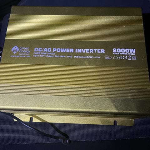 Black & Decker BDV066 inverter med en effekt på 400 watt og en ren sinus 2000w . Enheden konverterer 12V DC til 230V AC og har to strømafbrydere og to stikkontakter. Designet til brug med 12V batterisystemer.