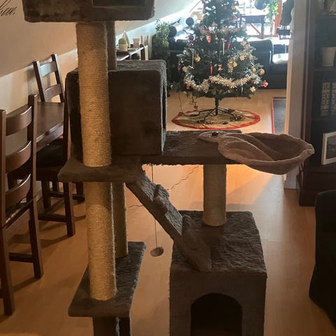 Kradsetræ i grå farve med flere platforme, huler og hængekøjer. Materialet er beklædt med blødt stof og sisal til kløning. Velegnet til katte til leg og hvile.