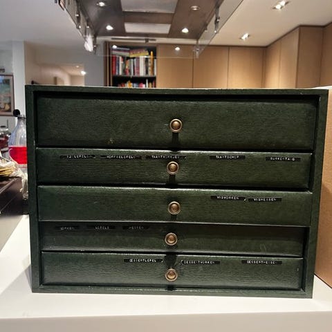 Beskrivelse: Smuk bestikskuffe model America bestående af: 6 middags skeer, 6 middags gafler, 6 middags knive, 6 dessert skeer, 6 dessert gafler, 6 dessert knive, 6 (store) kaffeskefulde, 2-delt tranche sæt, 2 grøntsags skeer, kartoffelske, jus ske og ostehøvl. Leveres med en neutral bestikæske.