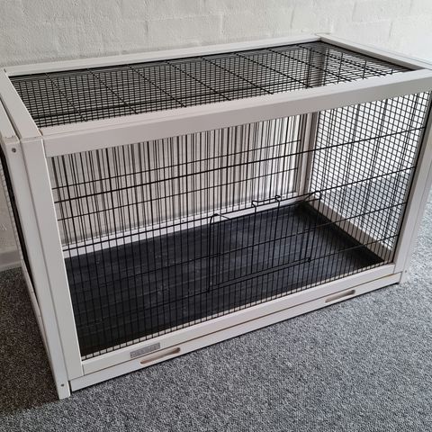 Bur lavet af træ og netramme i sort farve. Indeholder flere grene til klatring. Egnet til fugle. Der er en skuffe dig bunden til udskiftning af papir/sand og åbninger på den ene side af buret, samt den ene side af taget.