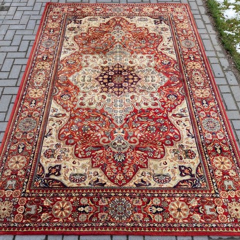 Tæppet har et rigt udført centralt medaillon, varme gyldne og jordlige nuancer og en bred, elegant kant med traditionelle motiver, inspireret af østlige tæppeudformninger.