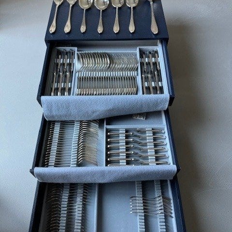 Det inkluderer 12 forretgafler og knive, 12 gafler, knive og spiseskeer til hovedret, 12 gafler, knive og skeer til dessert, 12 gafler og knive til fisk samt 10 yderligere serveringsstykker, som ses på billederne, plus bakken, alt sammen købt i Christofle-butikken i Rhodes island, Greece i 1968.