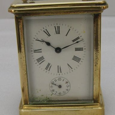 Sydtysk, Sveitsisk messing karetteur ur med 8-dages mekanisk alarmur og platform-escapement synlig gennem toppen; mål 12 × 7 × 5,5 cm; vægt 830 g; ældre estimeret periode 1850–1900; god stand; med nøgle og originalt læderrejseetui; virker godt; hårline revne fra kl. 9 til 3. Klik på den blå "gå til varen" knap, for at købe eller byde på denne vare. Den samlede pris vil blive vist inden du afgiver dit bud.
