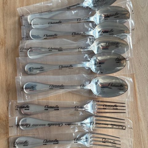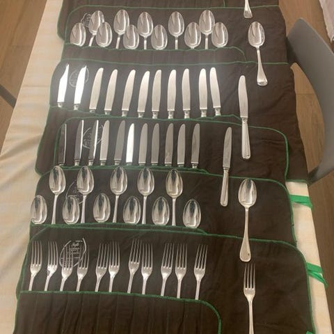 Christofle bestik sæt model Spatours til 12 personer. 87 stykker, ny, aldrig brugt, med anti-oxidationsetuier, således sammensat.