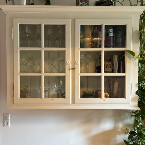 Skabet har 3 låger, en af dem med glas i. Samt fine afrundede metalgreb.