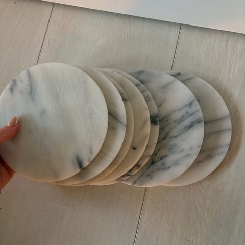 Serveringsfad eller kageplatte i marmor med ét håndtag i lakeret træ placeret i midten og fadet er med 3 små "gummisko" som "fødder"
