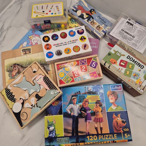 Spilpakke 1: 3 stk. Puslespil til 2-3 år: Taltog, superheltetog, og dinotog. Alle brikker samt bøger til de to sidste er der. Fra hjem uden dyr og røg. Sælges kun samlet.