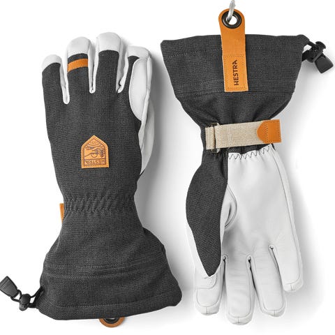 ""Hestra Army Leather Heli Ski 5‑Finger kombinerer en vindtæt og vandafvisende skal med gedeskind i håndfladen for optimalt greb og holdbarhed. Den aftagelige G‑Loft‑isolering og fleeceforing holder hænderne varme selv ved fugt, og den lange manchet med snelås og justerbar rem sikrer, at sne og kulde holdes ude. Handsken har desuden karabinhage og læderstrop for nem ophængning.""