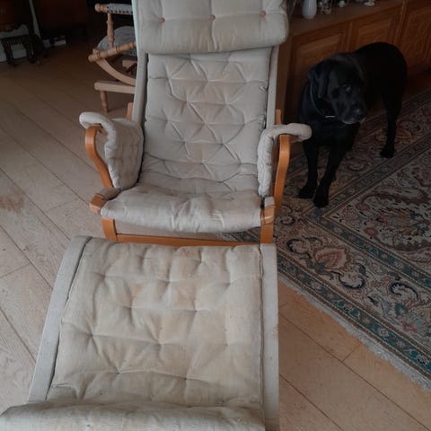 Fin retro lænestol i Bruno Mathsson stil. Kan ikke umiddelbart se mærke.