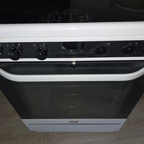 Siemens induktion komfur med ovn. Komfuret har induktionskogeplader, der sikrer effektiv og præcis varmefordeling. Designet i hvid farve med kontrolknapper på frontpanelet.