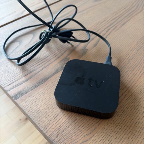 Apple TV streaming-enhed i sort farve. Enheden bruges til at streame indhold til TV via internetforbindelse. Leveres med strømforsyningskabel.