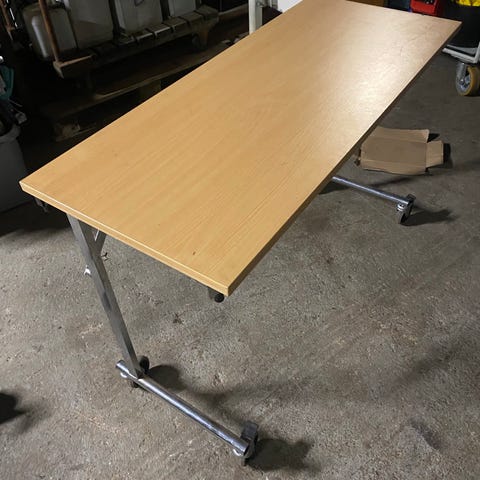 Borde i solid kvalitet med bordplade i trælaminat og stel i metal. Bordet har en rektangulær form og en overflade med træstruktur. Stellet er i grå metal og kan klappes sammen. Velegnet til brug som arbejds- eller computerbord, kursus og foredrags-borde, eller lignende. Bordene er i en rigtig god kvalitet.