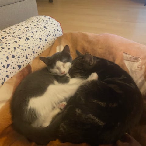 To steriliseret og chippet hun katte på hhv ca 3 og 6 år, søger nyt hjem. Kattene fungere både som indekatte men også som staldkatte.