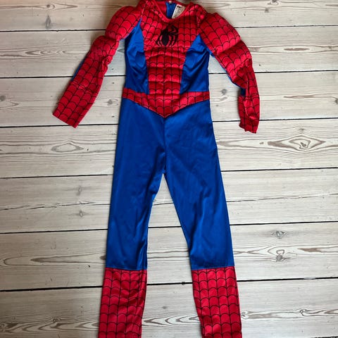 Superman-dragt inkl. kappe i str. 128. Har ikke som sådan slid eller brugsspor og er klar til brug. Min drengs navn står i mærke i nakken og kan med lethed klippes af.