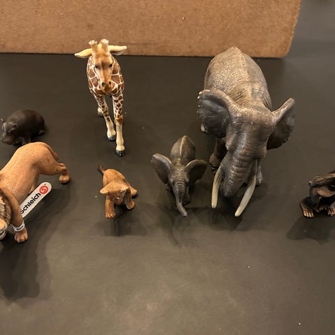 Schleich dyresamling bestående af forskellige dyrefigurer i plast, herunder giraf, krokodille, flodhest, kamel, og slange. Figurenes detaljer og størrelse gør dem velegnede til leg og samling. Sælges kun som sæt.