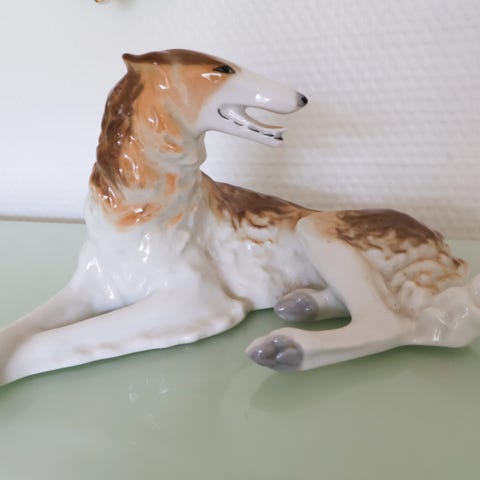 Der er en lille glasur skade ved hundens ene øre. Ellers er figuren helt perfekt. måler 13,5cm høj.