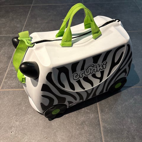 Fin Trunki kuffert med zebra motiv. Lidt brugsspor på siderne (se billeder). Fungerer ellers helt fint.