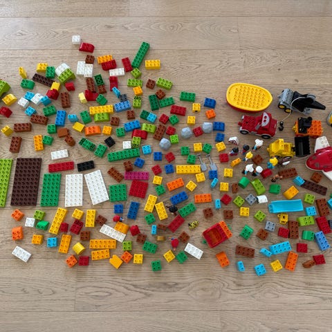 En stor plade og to store poser med DUPLO inkl. mange dyr og mennesker, biler, fly, motorcykel, og mange specialklodser. Se billeder.