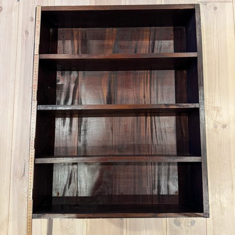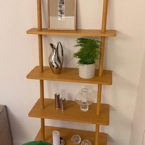 Reol i træ med 5 hylder. Reolens design består af åbne hylder med lamelplanker, hvilket giver god luftcirkulation og synlighed af opbevarede genstande. Hylderne er velegnede til opbevaring af bøger, dekorationer eller andre husholdningsartikler. Materialet er træ med en naturlig finish.