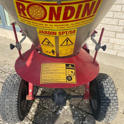 Rondini SP7/50 spredemaskine med stor tragt og robuste hjul. Maskinen er designet til effektiv spredning af materialer og er velegnet til brug i have- og landbrugsarbejde.