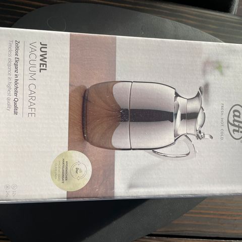 Designet er klassisk og tidløst med matpoleret stålkrop og blank forkromet top og hank. Leveres i original æske, som også ses på billederne – ideel både til brug og som gave.