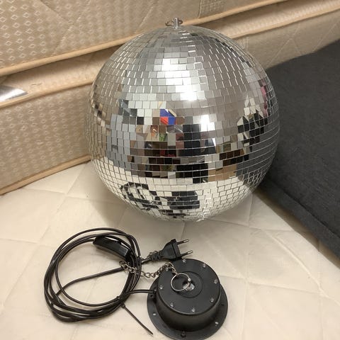 Professionel (med mindre og flere facetter så den laver flere refleksioner) spejlkugle i 40cm diameter. Hængt på et værelse og har aldrig været flyttet rundt så i perfekt stand.