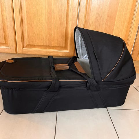 Stork lift til barnevogn i mørkeblå farve med lys kant. Inkluderer madras fra dunlopillo. Designet til brug i barnevognen for at give komfort og støtte til barnet.
