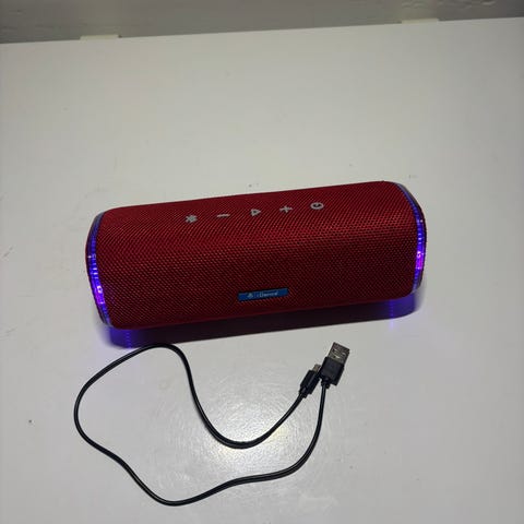 Dette er en kompakt Bluetooth-højttaler med indbygget FM-radio. Højttaleren er sort og har en rektangulær form med dimensionerne 20x8x5 cm. Den er udstyret med en USB-tilslutning til opladning og kan også anvendes med en 3.5 mm aux-kabel, hvilket gør den alsidig for forskellig tilslutning. Højttaleren angiver en Bluetooth version 5.0 med en batterikapacitet på 1200 mAh, hvilket giver en arbejdstid på 3-5 timer. Den har en samlet højttalerkapacitet på 2 x 3 W. Der er en praktisk strop på siden for nem transport. Tags: bluetooth, højttaler, radio, bærbar.