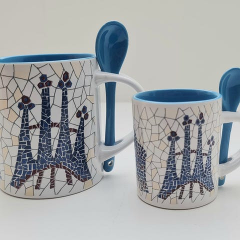 To keramiske kaffekopper dekoreret med et mosaikmønster, der minder om Gaudís stil i Barcelona. Hver kop har ordet 'Barcelona' skrevet på håndtaget. De har en unik trekantet form, ideelle til servering af varme drikke. Størrelsen er 9x11 cm.