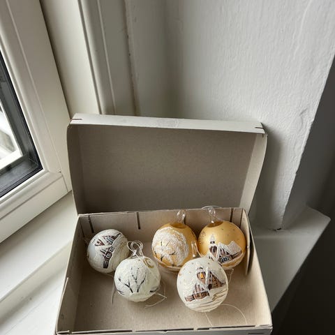 Sættet indeholder 12 klare glaskugler, hver fyldt med små hvide kugler, der giver en effekt af snefnug. Der er et hvidt snefnug-design på ydersiden af hver kugle.