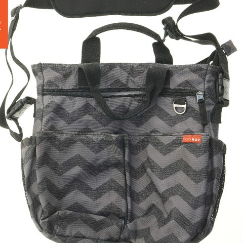 Dette er en sort pusletaske fra mærket Skip Hop. Tasken har et kompakt design med en størrelse på 30x23 cm. Den har en ydre lynlås lomme samt en kliklås. Tasken folder ud for at give en blød og vaskbar underlag til bleskift. Indersiden har et farverigt mønster med kvadrater i forskellige farver. Tasken er praktisk til forældre med små børn, der har brug for en bærbar løsning til bleskift.