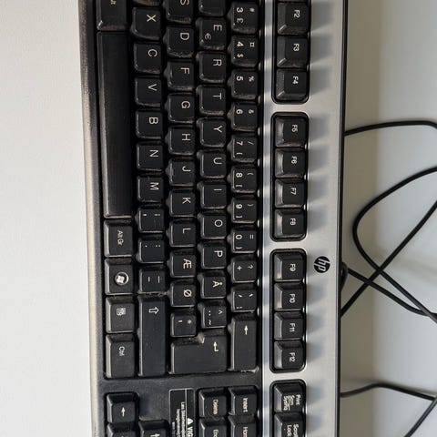 HP trådløst tastatur og mus sæt i hvid farve. Sættet inkluderer et fuldt tastatur med numerisk del og en trådløs mus. Designet til generel brug med trådløs tilslutning via USB-modtager.