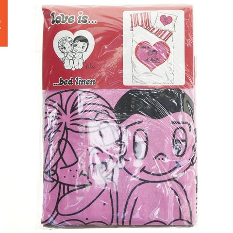 Et sengesæt med 'Love is...' tema. Sættet inkluderer et dynebetræk på 140 x 200 cm og et pudebetræk på 60 x 63 cm. Designet viser en romantisk illustration af et par. Materialet er angivet som 100% bomuld og er i farven rød med et trykt mønster.
