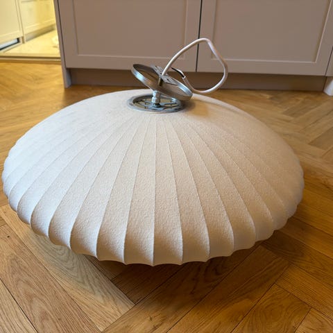 George Nelson's Nelson Saucer Bubble Stor Pendel er en exceptionel flot lampe, som både kan fylde et lille, men også et stort bord med sine mange størrelser. Lampen har et flot og elegant design, hvilket gør den essentiel som pendel, idet man kan placere dens enkle design næsten overalt. Det aflange mønster giver den rig mulighed for at dække runde borde til perfektion. Født i Connecticut, USA, var George Nelson en af de mest indflydelsesrige figurer i en utrolig ung periode i moderne design. Studerende på Yale som arkitekt, troede han på, at det var designerens job at gøre verden til et bedre sted, veed brug af perfektionen i naturens kreationer. Han er et af menneskerne bag verdenshistoriens ændringer og forløb. I en anden tid udenfor hans egen, bliver hans designs stadig bygget og produceret og Nelson Bubble serien, er det seneste svar fra HAY. Med flere af hans design på spil, er lampeserien allerede faldet i god jord hos HAY.