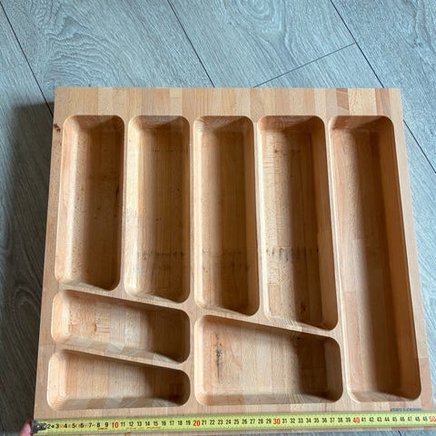 Skuffeindsatsen er designet til at organisere indholdet i en skuffe. Skuffeindsatsen er fra Mølballe A/S, og den har været i et Svane Køkken.