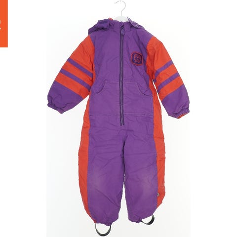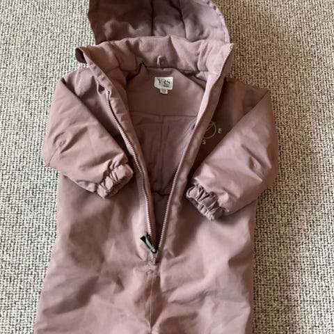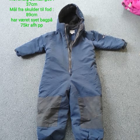 Flyverdragt, mørkeblå med rosa blomstret mønster. Med aftagelig hætte samt elastik omkring håndled og ankler. Justerbare stropper under fødderne som forhindrer dragten i at glide op. Lukkes med to lynlåse på forsiden, så den er let at tage af og på.