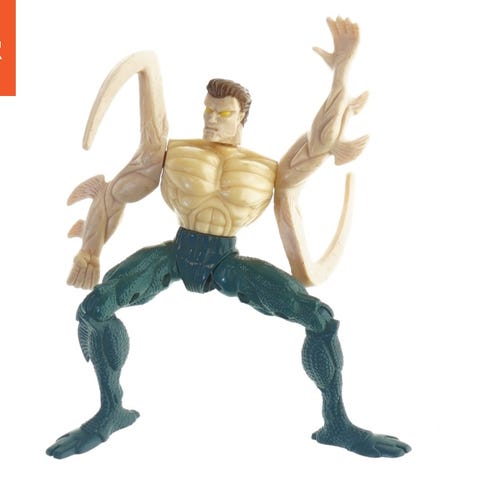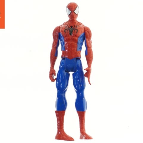 En Marvel actionfigur. Sorte bukser og jakke, rød skjorte og grå støvler. Figuren er udstyret med detaljer som et bælte og handsker.