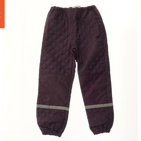 Et par grå termobukser med elastisk talje og manchetter ved anklerne. De har et quiltet design med forstærkede områder på knæene.