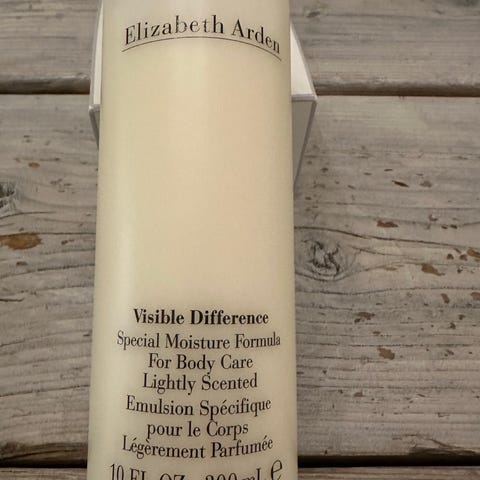 Elizabeth Arden Visible Difference Body Care er en kropsplejeprodukt på 175 ml. Den indeholder squalane, propylene glycol og glycerin, og er lavet til at pleje huden. Brugt meget lidt, som du kan se.