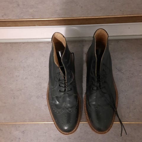 Disse støvler er lavet af sort læder og har snøre foran. Designet er klassisk med brogue detaljer på snuden og siderne. Sålen viser tegn på brug, og der er slid på hælen. Støvlerne måler størrelse 39. Passer godt til casual og formelle outfits.