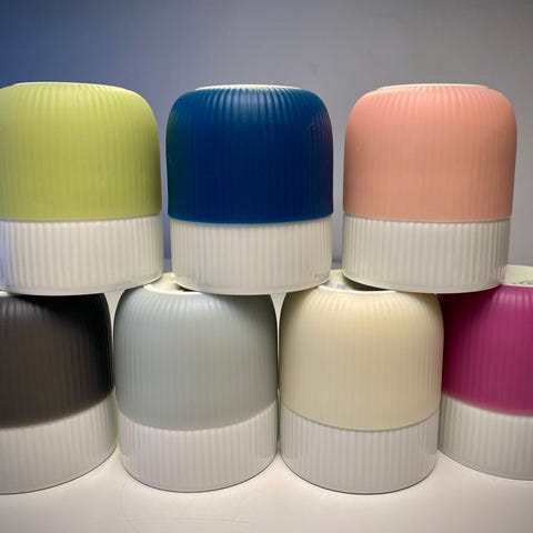 Royal Copenhagen termokrus i flere farver. Krusene har en glat, hvid overdel og en farvet underdel med rillet tekstur.