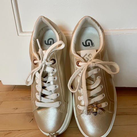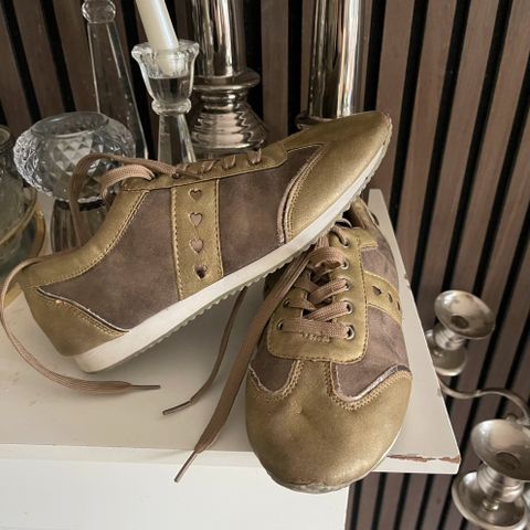 Fede gummisko med guld og glimmer, detaljer med lynlås og snørebånd. Virker umiddelbart mere som en Str 38 end en Str 39