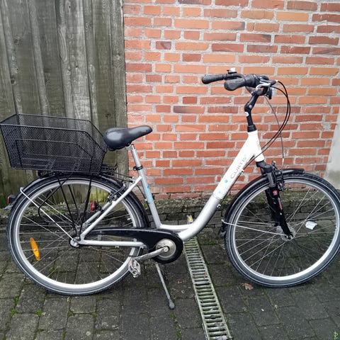 Damecykel med gear, kurv, stærk kædelås. Brugt stand men virker. Betrækket på sadlen er slidt og derfor bliver sadlen våd når det regner. Den kan godt bruges alligevel, jeg har bare en plastikpose ud over.